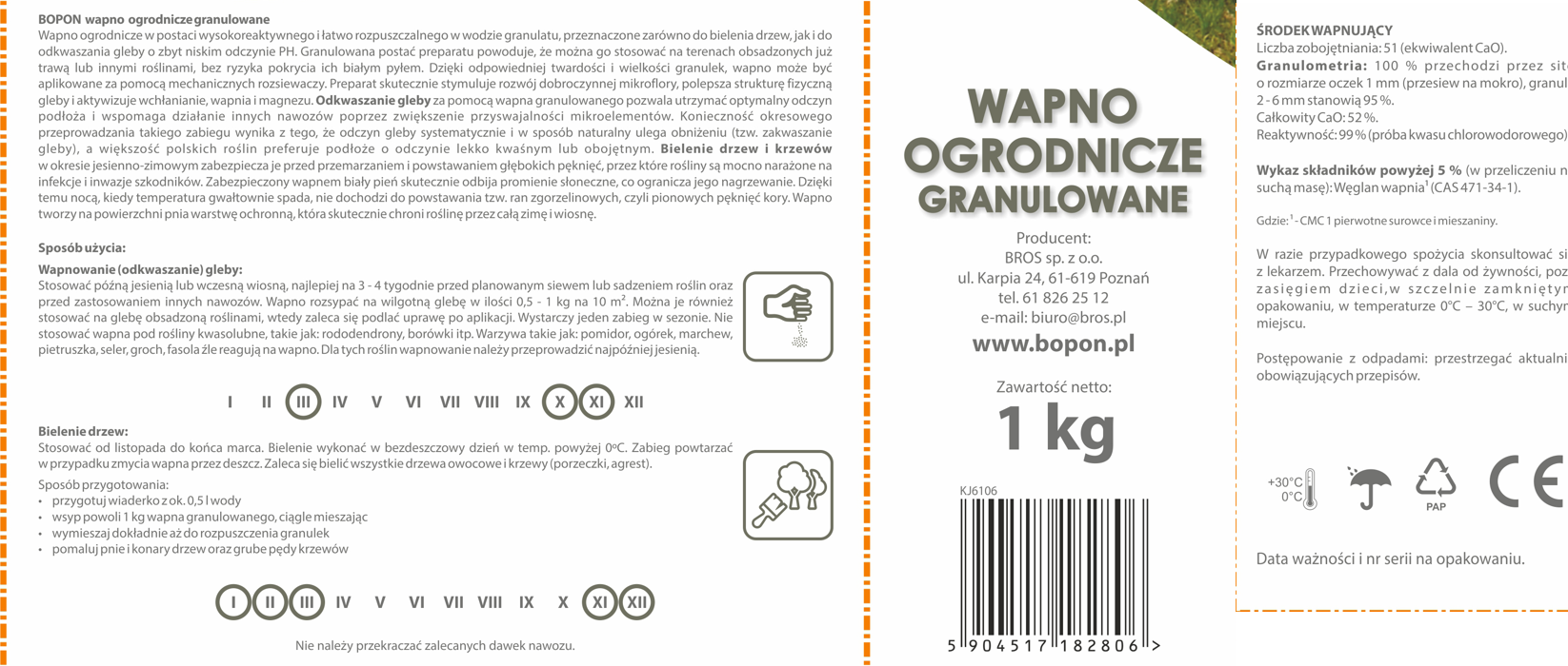 Wapno ogrodnicze w postaci wysokoreaktywnego i łatwo rozpuszczalnego w wodzie granulatu, przeznaczone zarówno do bielenia drzew, jak i do odkwaszania gleby o zbyt niskim odczynie pH. Granulowana postać preparatu powoduje, że można go stosować na terenach obsadzonych już trawą lub innymi roślinami. Preparat skutecznie stymuluje rozwój dobroczynnej mikroflory, polepsza strukturę fizyczną gleby i aktywizuje wchłanianie azotu, fosforu, wapnia, magnezu i boru.